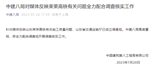 央視網(wǎng)消息:據(jù)“中建八局”公眾號(hào)消息,中國(guó)建筑第八工程局有限公司表示,針對(duì)媒體反映山東萊榮高鐵有關(guān)施工質(zhì)量問題,山東省交通運(yùn)輸廳已成立調(diào)查組。中建八局高度重視,將全力配合調(diào)查組開展調(diào)查核實(shí)工作。