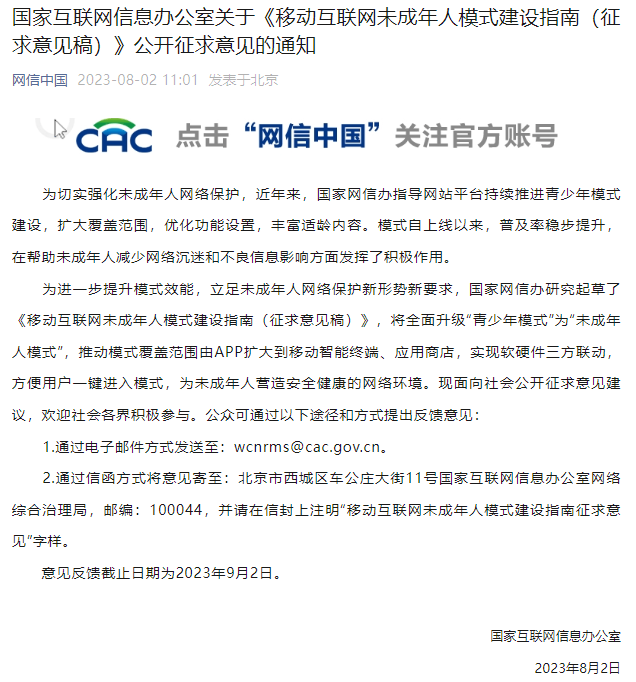 為進一步提升模式效能,立足未成年人網(wǎng)絡保護新形勢新要求,國家網(wǎng)信辦研究起草了《移動互聯(lián)網(wǎng)未成年人模式建設指南(征求意見稿)》,將全面升級“青少年模式”為“未成年人模式”,推動模式覆蓋范圍由APP擴大到移動智能終端、應用商店,實現(xiàn)軟硬件三方聯(lián)動,方便用戶一鍵進入模式,為未成年人營造安全健康的網(wǎng)絡環(huán)境?,F(xiàn)面向社會公開征求意見建議,歡迎社會各界積極參與。公眾可通過以下途徑和方式提出反饋意見:
