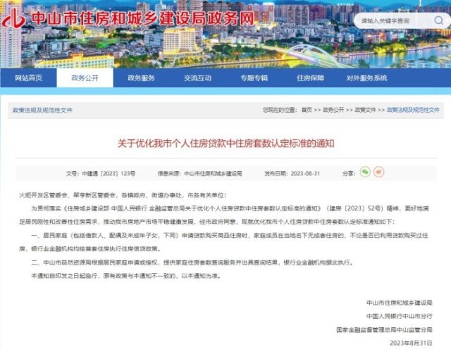 中新網(wǎng)8月31日電 據(jù)廣東省中山市住房和城鄉(xiāng)建設局網(wǎng)站消息,31日,中山市住房和城鄉(xiāng)建設局、中國人民銀行中山市分行、國家金融監(jiān)督管理總局中山監(jiān)管分局等三部門聯(lián)合發(fā)布《關于優(yōu)化我市個人住房貸款中住房套數(shù)認定標準的通知》。通知提出,居民家庭(包括借款人、配偶及未成年子女,下同)申請貸款購買商品住房時,家庭成員在當?shù)孛聼o成套住房的,不論是否已利用貸款購買過住房,銀行業(yè)金融機構均按首套住房執(zhí)行住房信貸政策。