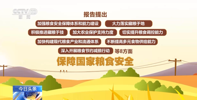 報告提出,將從加強糧食安全保障體系和能力建設、大力落實藏糧于地、積極推進藏糧于技、加大農(nóng)業(yè)保護支持力度、切實提升糧食調(diào)控能力、加快構建現(xiàn)代糧食產(chǎn)業(yè)和流通體系、不斷提高多元食物供給能力、深入開展糧食節(jié)約減損行動等8方面,保障國家糧食安全。