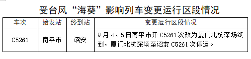 據(jù)中央氣象臺消息,今年第11號臺風“??睂⒂?日凌晨到上午在福建漳浦至廣東惠來一帶沿海登陸,福建東部部分地區(qū)可能有大到暴雨,福建東南部部分地區(qū)有大暴雨,局地特大暴雨。為防范臺風影響,保障運輸安全,中國鐵路南昌局集團有限公司調整部分旅客列車運行方案,停運途經(jīng)杭深線管內漳州(不含)至詔安區(qū)段旅客列車。