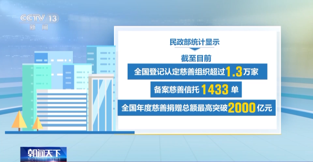 民政部統(tǒng)計(jì)顯示,截至目前,全國(guó)登記認(rèn)定慈善組織超過1.3萬家;備案慈善信托1433單;全國(guó)年度慈善捐贈(zèng)總額最高突破2000億元。