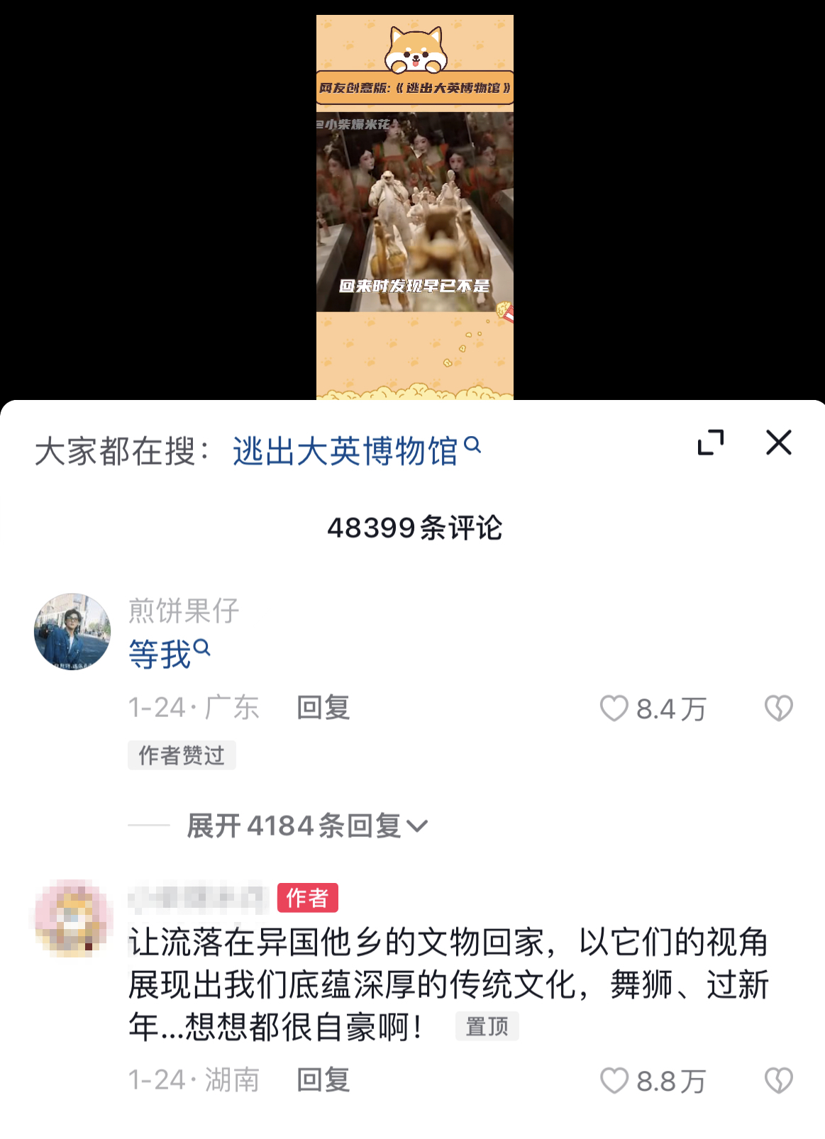 《逃出大英博物館》由兩位90后自媒體人“煎餅果仔”和“夏天妹妹噢”共同創(chuàng)作。短片上線前期,正逢大英博物館被多個(gè)國家要求歸還本國文物,戳中了每一個(gè)中國人強(qiáng)烈期盼流失海外文物早日回家的內(nèi)心。
