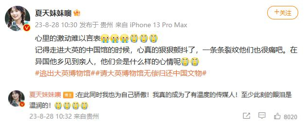 預(yù)告片發(fā)布后,up主“夏天妹妹噢”難掩激動(dòng)之情,她清楚地記得自己走進(jìn)大英博物館的中國館時(shí),心真的狠狠顫抖了?!耙粭l條裂紋他們也很痛吧,在異國他鄉(xiāng)見到親人,他們會(huì)是什么樣的心情呢?”同時(shí),她也為自己真正成為了有溫度的傳媒人而驕傲。