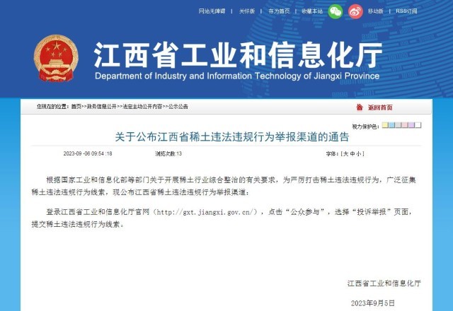 中新網(wǎng)9月6日電 據(jù)江西省工業(yè)和信息化廳官網(wǎng)6日消息,根據(jù)國家工業(yè)和信息化部等部門關(guān)于開展稀土行業(yè)綜合整治的有關(guān)要求,為嚴厲打擊稀土違法違規(guī)行為,廣泛征集稀土違法違規(guī)行為線索,現(xiàn)公布江西省稀土違法違規(guī)行為舉報渠道:登錄江西省工業(yè)和信息化廳官網(wǎng),點擊“公眾參與”,選擇“投訴舉報”頁面,提交稀土違法違規(guī)行為線索。