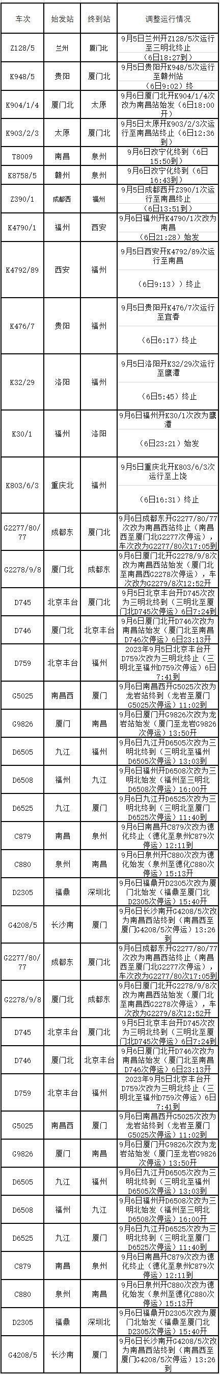 受臺(tái)風(fēng)“海葵”殘余環(huán)流影響,預(yù)計(jì)9月6日8時(shí)至7日8時(shí),福建東部和南部、江西南部等地有大到暴雨,其中福建東南部沿海部分地區(qū)有大暴雨,局地有雷暴大風(fēng)等強(qiáng)對(duì)流天氣。為確保人民生命財(cái)產(chǎn)安全和鐵路運(yùn)輸安全,中國(guó)鐵路南昌局集團(tuán)有限公司(以下簡(jiǎn)稱南鐵)調(diào)整9月6日、7日部分旅客列車運(yùn)行方案(具體見(jiàn)附件)。