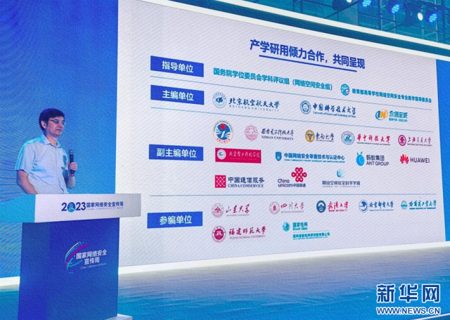 教育部高等學(xué)校網(wǎng)絡(luò)空間安全專(zhuān)業(yè)教學(xué)指導(dǎo)委員會(huì)副主任委員、中國(guó)科學(xué)技術(shù)大學(xué)網(wǎng)絡(luò)安全學(xué)院執(zhí)行院長(zhǎng)俞能海在現(xiàn)場(chǎng)發(fā)布白皮書(shū)。新華網(wǎng)發(fā)(主辦方供圖)