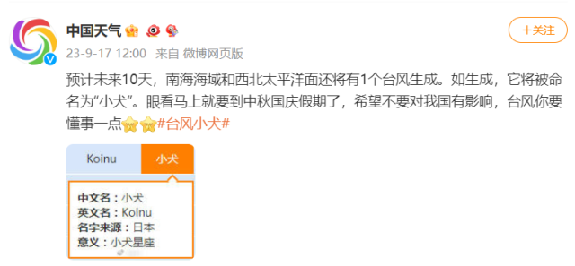 央視網(wǎng)消息:據(jù)@中國天氣 微博消息,預(yù)計未來10天,南海海域和西北太平洋面還將有1個臺風生成。如生成,它將被命名為“小犬”。