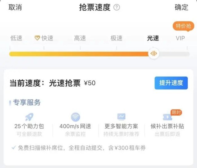 此外,許多第三方平臺推出搶票加速服務(wù)。例如,某平臺實行階梯服務(wù)及價位,速度從快速、高速、極速、光速到VIP,分別提供5-40個“助力包”,網(wǎng)速為200-500m/s,價格從10-80元不等,平臺會贈送助力包,也可通過邀請好友獲取。該平臺還推出專人搶票功能,使用該功能可以24小時不間斷、通過更多渠道搶票,提高搶票成功率,價格為30元。此外,搶靠窗、過道的位置需另外加價。