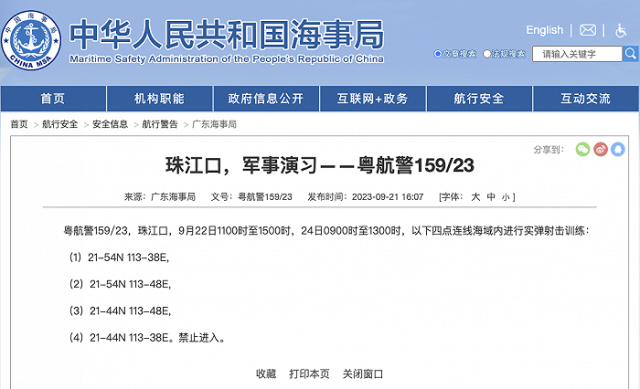 央視網(wǎng)消息:據(jù)中國海事局網(wǎng)站消息,廣東海事局發(fā)布航行警告,9月22日11時至15時,24日9時至13時,珠江口部分海域進行實彈射擊訓(xùn)練,禁止進入。