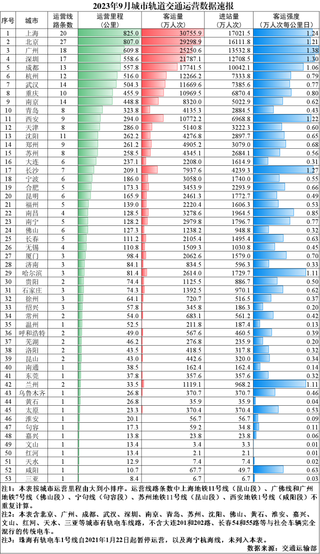 2023年9月,31個?。ㄗ灾螀^(qū)、直轄市)和新疆生產(chǎn)建設(shè)兵團(tuán)共有55個城市開通運營城市軌道交通線路299條,運營里程9859.5公里,實際開行列車318萬列次,完成客運量24.9億人次,進(jìn)站量14.9億人次。9月份,客運量環(huán)比減少2.2億人次、降低8.2%,同比增加7.1億人次、增長40%,較2019年月均客運量增加5億人次、增長24.9%。9月份客運強度平均水平為0.536萬人次每公里日,較2019年全年客運強度平均水平降低1.8%。