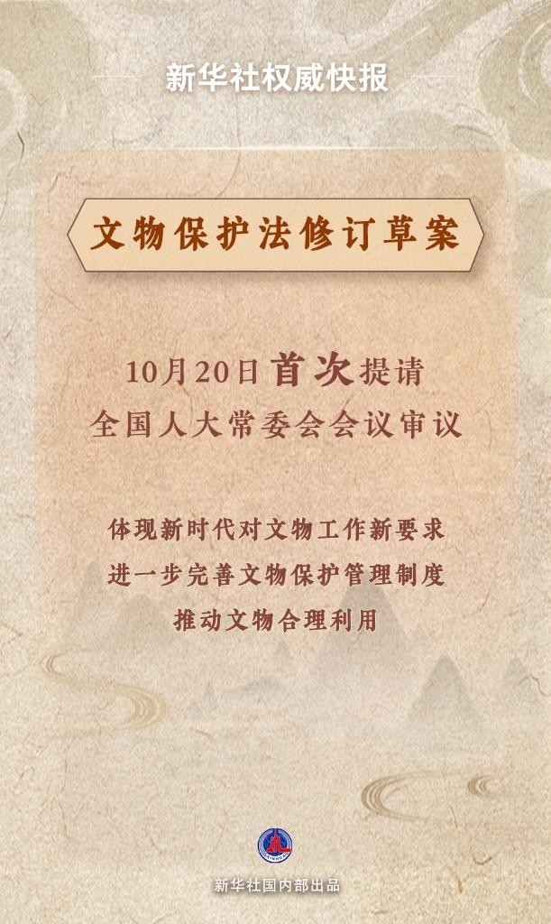 10月20日,文物保護法修訂草案提請十四屆全國人大常委會第六次會議首次審議。修訂草案貫徹黨中央決策部署,體現(xiàn)新時代對文物工作新要求;堅持把保護放在第一位,進一步完善文物保護管理制度;妥善處理保護和利用的關系,推動文物合理利用;多措并舉加大處罰力度,嚴厲打擊破壞文物違法行為。