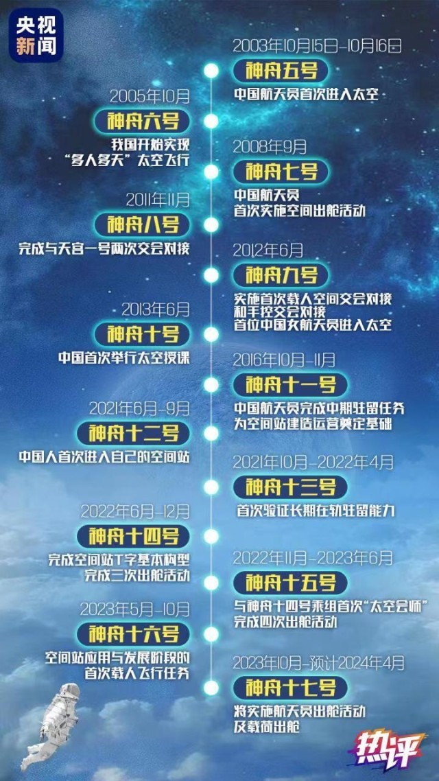 飛天20載,所向皆星河。從神五到神十七,從首次太空飛行到長期駐守空間站,20年間,我國載人航天事業(yè)實現(xiàn)跨越式發(fā)展,載人航天工程發(fā)射任務(wù)實現(xiàn)30戰(zhàn)30捷。有太多高光時刻值得銘記,每一步都夯實基礎(chǔ),每一步都標定未來。