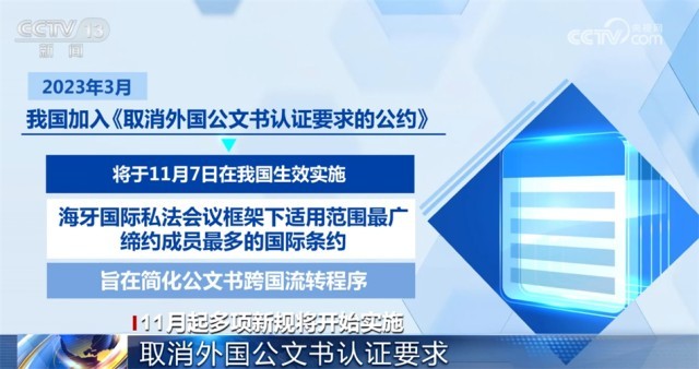 今年3月,我國(guó)加入《取消外國(guó)公文書認(rèn)證要求的公約》,《公約》將于11月7日在我國(guó)生效實(shí)施?!豆s》是海牙國(guó)際私法會(huì)議框架下適用范圍最廣、締約成員最多的國(guó)際條約,旨在簡(jiǎn)化公文書跨國(guó)流轉(zhuǎn)程序。11月7日起,中國(guó)送往其他締約國(guó)使用的公文書僅需辦理《公約》規(guī)定的附加證明書,即可送其他締約國(guó)使用,無需辦理中國(guó)和締約國(guó)駐華使領(lǐng)館的領(lǐng)事認(rèn)證。其他締約國(guó)公文書送中國(guó)內(nèi)地使用,只需辦理該國(guó)附加證明書,無需辦理該國(guó)和中國(guó)駐當(dāng)?shù)厥诡I(lǐng)館的領(lǐng)事認(rèn)證。