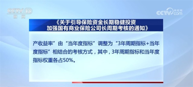 《通知》明確,為引導(dǎo)國有商業(yè)保險公司長期穩(wěn)健經(jīng)營,更好發(fā)揮中長期資金的市場穩(wěn)定器和經(jīng)濟(jì)發(fā)展助推器作用,加強(qiáng)對國有商業(yè)保險公司的長周期考核,根據(jù)《財(cái)政部關(guān)于印發(fā)<商業(yè)保險公司績效評價辦法>的通知》,將經(jīng)營效益指標(biāo)的“凈資產(chǎn)收益率”由“當(dāng)年度指標(biāo)”調(diào)整為“3年周期指標(biāo)+當(dāng)年度指標(biāo)”相結(jié)合的考核方式,其中,3年周期指標(biāo)和當(dāng)年度指標(biāo)權(quán)重各占50%。