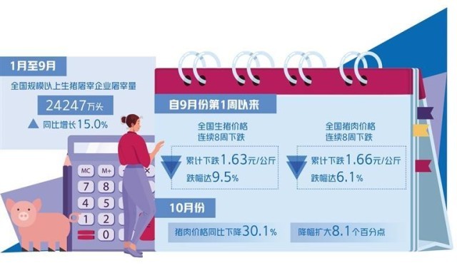 自9月份第1周以來(lái),全國(guó)生豬價(jià)格連續(xù)8周下跌,累計(jì)下跌1.63元/公斤,跌幅達(dá)9.5%;全國(guó)豬肉價(jià)格連續(xù)8周下跌,累計(jì)下跌1.66元/公斤,跌幅達(dá)6.1%。10月份第4周,全國(guó)豬肉平均價(jià)格25.60元/公斤,比前一周下跌1.2%,同比下跌38.5%。