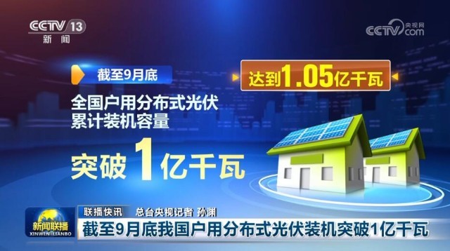 截至9月底,全國戶用分布式光伏累計裝機容量突破1億千瓦,達到1.05億千瓦。今年前9個月,全國戶用分布式光伏新增裝機3297.7萬千瓦,是去年全年的1.3倍。