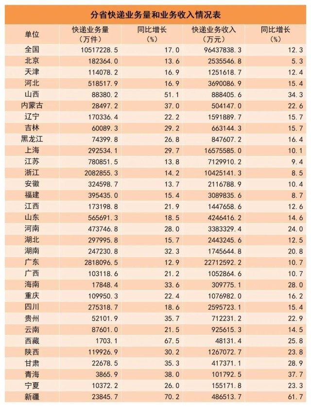 1-10月,同城快遞業(yè)務(wù)量累計完成108.3億件,同比增長2.7%;異地快遞業(yè)務(wù)量累計完成919.2億件,同比增長18.2%;國際/港澳臺快遞業(yè)務(wù)量累計完成24.2億件,同比增長55.1%。