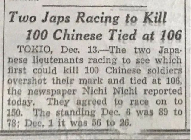 “根據(jù)《東京日日新聞》報(bào)道,兩名日本軍官比賽看誰能先殺死100名中國(guó)士兵,結(jié)果都?xì)⒘顺^100人,雙方打平殺了106人,他們又同意重新比賽殺到150人為止,12月6日是89比78,12月1日是56比26。”這是1937年12月14日發(fā)行的《芝加哥每日論壇》中,一篇有關(guān)兩名日本軍官進(jìn)行“百人斬”殺人競(jìng)賽的報(bào)道節(jié)選。