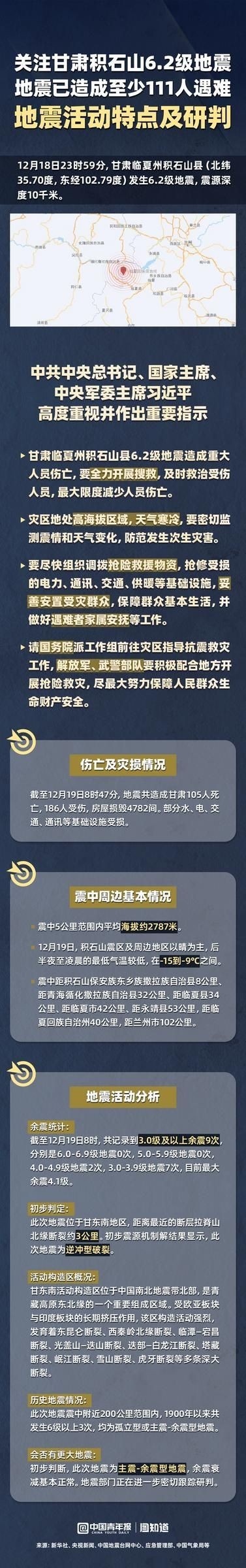 地震專家表示余震衰減基本正常,甘肅積石山6.2級地震救援正在緊張進(jìn)行中。截至12月19日8時,共記錄到3.0級及以上余震9次。這次地震有何特點(diǎn)?周邊基本海拔、溫度情況如何?歷史上發(fā)生過哪些地震?是否會有更大的地震出現(xiàn)?中國地震臺網(wǎng)中心專家作出初步研判。