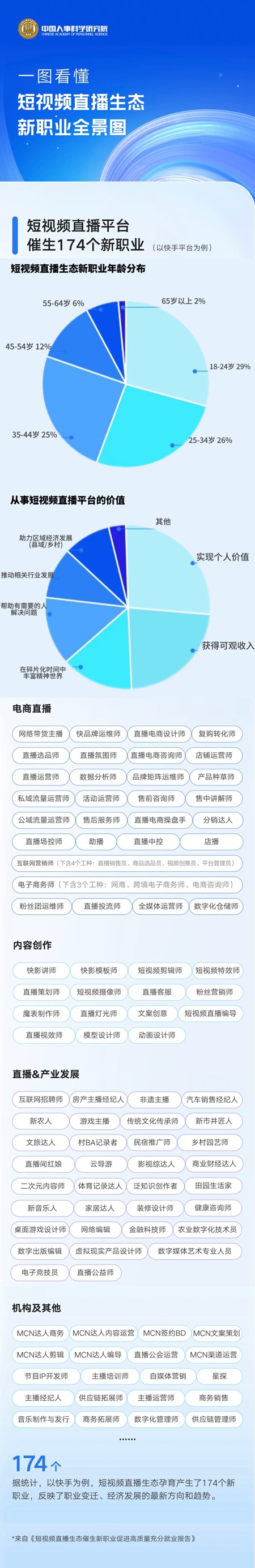 中國(guó)人事科學(xué)研究院近期發(fā)布的《短視頻直播生態(tài)催生新職業(yè)促進(jìn)高質(zhì)量充分就業(yè)報(bào)告》顯示,一塊屏幕背后發(fā)生了諸多變化:中青年成短視頻直播生態(tài)新職業(yè)的主力軍。其中,18-24歲占29%,25-34歲占26%,35-44歲占25%。18-34歲占比達(dá)到55%?!吨腥A人民共和國(guó)職業(yè)分類(lèi)大典(2022年版)》的1639個(gè)職業(yè)中,短視頻平臺(tái)快手覆蓋八成以上的數(shù)字職業(yè),為勞動(dòng)者提供了更廣闊的職業(yè)發(fā)展空間。