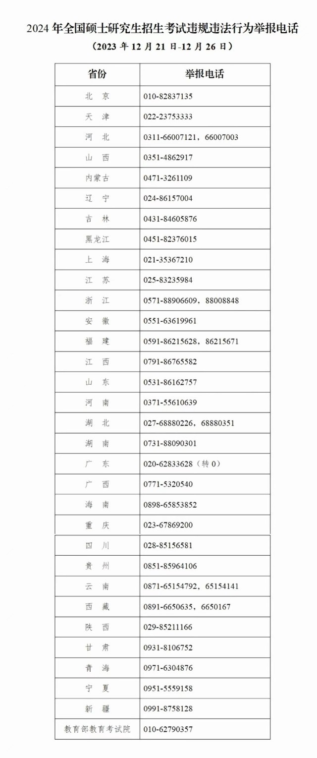 教育部和各?。▍^(qū)、市)教育招生考試機(jī)構(gòu)將開(kāi)通2024年研考舉報(bào)電話,歡迎廣大考生及社會(huì)各界人士及時(shí)舉報(bào)反映有關(guān)問(wèn)題線索。教育部及各?。▍^(qū)、市)將會(huì)同有關(guān)部門根據(jù)舉報(bào)線索第一時(shí)間核查處理,堅(jiān)決維護(hù)風(fēng)清氣正的研考環(huán)境。