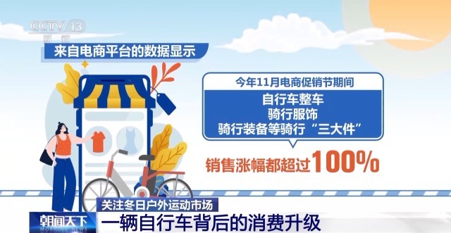 來自電商平臺的數(shù)據(jù)顯示,今年11月電商促銷節(jié)期間,自行車整車、騎行服飾、騎行裝備等騎行“三大件”的銷售漲幅都超過100%。其中公路自行車暴漲300%、自行車碼表及配件增長230%。