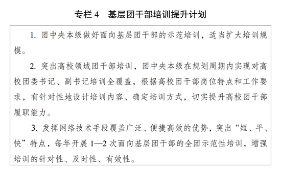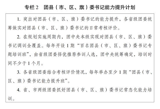?。ǘ┩怀觥瓣P(guān)鍵少數(shù)”政治訓(xùn)練。堅(jiān)持把政治訓(xùn)練貫穿團(tuán)干部成長(zhǎng)全周期,使團(tuán)干部的政治素養(yǎng)、政治能力與擔(dān)負(fù)的領(lǐng)導(dǎo)職責(zé)相匹配。強(qiáng)化“一把手”政治培訓(xùn),有計(jì)劃地選調(diào)團(tuán)的各級(jí)領(lǐng)導(dǎo)機(jī)關(guān)主要負(fù)責(zé)同志到團(tuán)干部教育培訓(xùn)機(jī)構(gòu)參加專題培訓(xùn)。強(qiáng)化對(duì)團(tuán)縣(市、區(qū)、旗)委書記這一群體的培訓(xùn),實(shí)施團(tuán)縣(市、區(qū)、旗)委書記能力提升計(jì)劃(專欄2)。突出對(duì)團(tuán)的領(lǐng)導(dǎo)機(jī)關(guān)干部的政治訓(xùn)練,各級(jí)團(tuán)的領(lǐng)導(dǎo)機(jī)關(guān)加強(qiáng)對(duì)機(jī)關(guān)干部的常態(tài)化政治能力培訓(xùn)。加強(qiáng)對(duì)青年人才的政治引領(lǐng),團(tuán)中央組織部會(huì)同有關(guān)單位每年組織一定數(shù)量青年人才開展國情研修。積極推動(dòng)將地方團(tuán)的領(lǐng)導(dǎo)機(jī)關(guān)班子成員培訓(xùn)納入地方黨委組織開展的干部政治理論培訓(xùn)范疇。