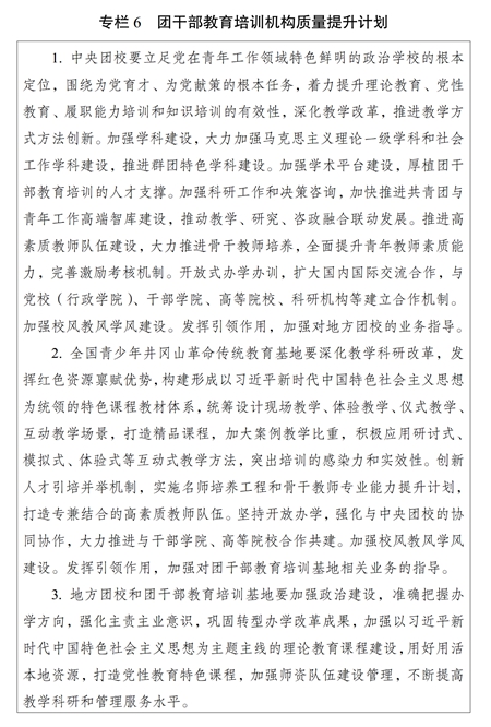 ?。ㄒ唬┡嘤?xùn)機(jī)構(gòu)建設(shè)。加強(qiáng)團(tuán)干部教育培訓(xùn)機(jī)構(gòu)規(guī)范管理和質(zhì)量提升,推進(jìn)各級(jí)團(tuán)校、團(tuán)干部教育培訓(xùn)基地建設(shè),構(gòu)建以中央團(tuán)校、全國青少年井岡山革命傳統(tǒng)教育基地為龍頭,各級(jí)團(tuán)校、團(tuán)干部教育培訓(xùn)基地相互補(bǔ)充、布局合理、規(guī)范有序的培訓(xùn)機(jī)構(gòu)體系,強(qiáng)化中央團(tuán)校對(duì)地方團(tuán)校的業(yè)務(wù)指導(dǎo),不斷提高辦學(xué)水平。加強(qiáng)各類團(tuán)干部教育培訓(xùn)機(jī)構(gòu)規(guī)范管理,開展團(tuán)干部教育培訓(xùn)機(jī)構(gòu)辦學(xué)質(zhì)量評(píng)估。支持各地各級(jí)團(tuán)組織聯(lián)合開展培訓(xùn),鼓勵(lì)團(tuán)干部教育培訓(xùn)機(jī)構(gòu)開展區(qū)域協(xié)作交流,推動(dòng)優(yōu)質(zhì)培訓(xùn)資源共建共享。實(shí)施團(tuán)干部教育培訓(xùn)機(jī)構(gòu)質(zhì)量提升計(jì)劃(專欄6)。