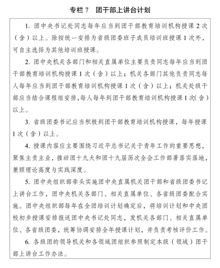 ?。ǘ熧Y隊(duì)伍建設(shè)。加大名師培養(yǎng)引進(jìn)力度,把團(tuán)干部教育培訓(xùn)師資納入各級(jí)青年人才政策支持范疇,努力造就一批對(duì)黨忠誠、精通黨的創(chuàng)新理論、授課水平高、在學(xué)科領(lǐng)域有影響力的知名教師。加強(qiáng)師資隊(duì)伍黨性教育和業(yè)務(wù)培訓(xùn),完善專職教師通過列席會(huì)議、基層調(diào)研、掛職鍛煉等方式促進(jìn)知識(shí)更新、加深理論研究。通過“名師帶徒”等方式,加強(qiáng)中青年骨干教師培養(yǎng)。大力推進(jìn)團(tuán)干部上講臺(tái),實(shí)施團(tuán)干部上講臺(tái)計(jì)劃(專欄7)。注重在領(lǐng)導(dǎo)干部、先進(jìn)青年典型、優(yōu)秀基層團(tuán)干部中遴選培養(yǎng)師資。分級(jí)建設(shè)師資庫。探索建立符合團(tuán)干部教育培訓(xùn)特點(diǎn)的師資隊(duì)伍考核評(píng)價(jià)體系。