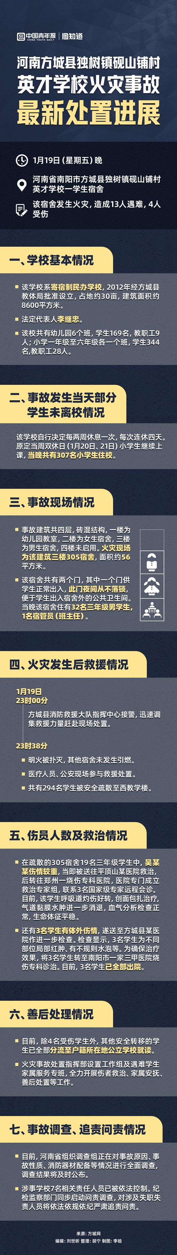 1月19日晚,河南省方城縣獨(dú)樹鎮(zhèn)硯山鋪村英才學(xué)校一宿舍發(fā)生火災(zāi),事故造成13人遇難,4人受傷。1月23日,方城縣通報(bào)了部分事故情況:當(dāng)晚有307名小學(xué)生住校,火災(zāi)現(xiàn)場(chǎng)為宿舍樓三樓305宿舍,面積56平方米;當(dāng)晚該宿舍住有32名三年級(jí)男學(xué)生,1名宿管員(班主任);涉事學(xué)校7名相關(guān)責(zé)任人員已被依法控制。