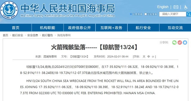 央視網(wǎng)消息:據(jù)中國海事局網(wǎng)站消息,清瀾海事局發(fā)布航行警告,2月3日7時至8時,南海部分海域有火箭殘骸掉落,禁止駛?cè)搿?/p>