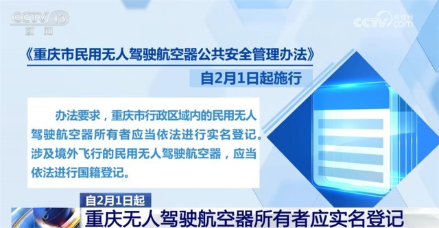 《重慶市民用無(wú)人駕駛航空器公共安全管理辦法》自2月1日起施行。辦法要求,重慶市行政區(qū)域內(nèi)的民用無(wú)人駕駛航空器所有者應(yīng)當(dāng)依法進(jìn)行實(shí)名登記。涉及境外飛行的民用無(wú)人駕駛航空器,應(yīng)當(dāng)依法進(jìn)行國(guó)籍登記。