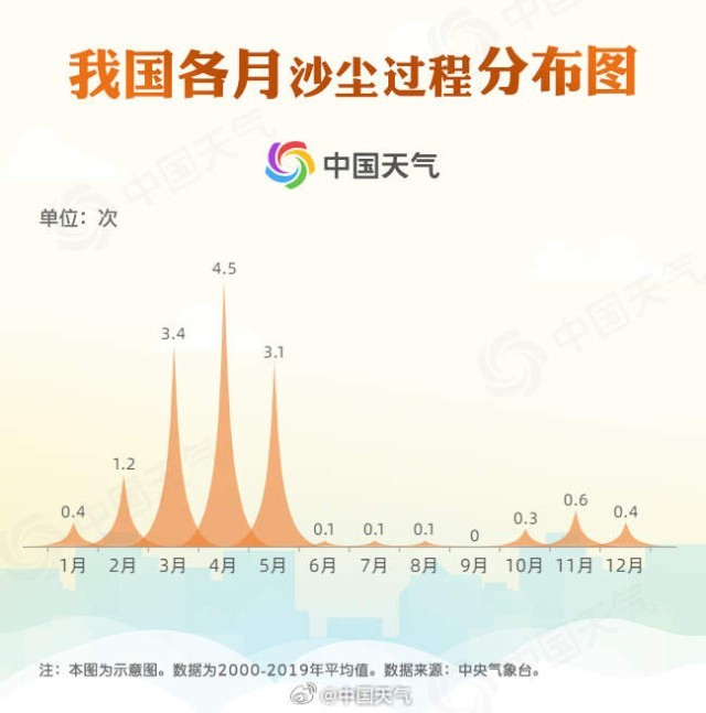 常年統(tǒng)計(jì)來(lái)看,我國(guó)沙塵天氣過(guò)程在一年中一般首次出現(xiàn)在2月,3-5月進(jìn)入高發(fā)期。從我國(guó)2000-2019年各月沙塵天氣過(guò)程的分布情況來(lái)看,3-5月的沙塵過(guò)程能占到全年的80%,4月份沙塵天氣最為頻繁,常年平均達(dá)到4.5次,3月和5月不相上下,分別為3.4次和3.1次。