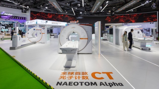 2023年11月8日在第六屆中國(guó)國(guó)際進(jìn)口博覽會(huì)醫(yī)療器械及醫(yī)藥保健展區(qū)拍攝的西門子展位。新華社記者 王翔 攝