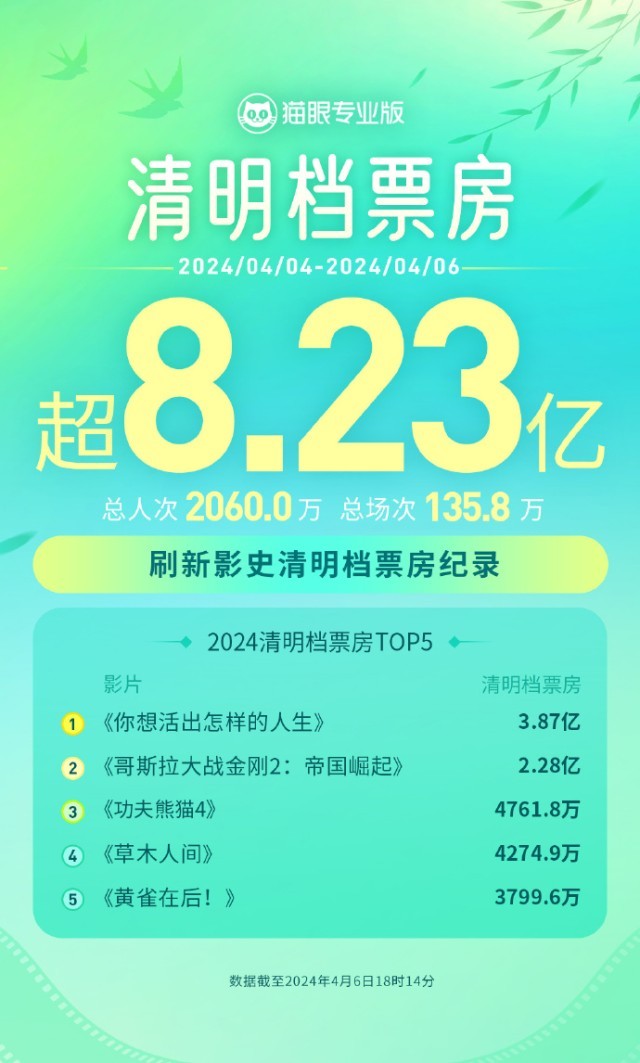 央視網(wǎng)消息:據(jù)貓眼專(zhuān)業(yè)版數(shù)據(jù),截至4月6日18時(shí)14分,2024年清明檔(4月4日—4月6日)總票房突破8.23億,超2021年清明檔票房成績(jī),刷新中國(guó)影史清明檔票房紀(jì)錄。