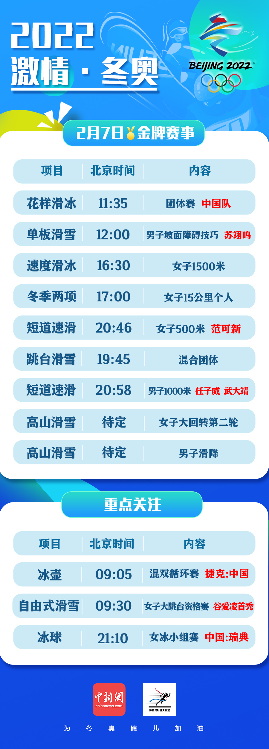中新網(wǎng)2月7日電 蘇翊鳴爭冠、谷愛凌首秀、中國短道速滑再沖金、速度滑冰“冬奧獎牌王”有望擴(kuò)大紀(jì)錄……7日的北京冬奧賽場,諸多看點(diǎn)值得期待。