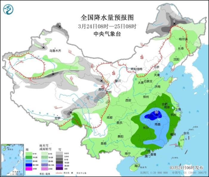 圖2 全國降水量預報圖(3月24日08時-25日08時)