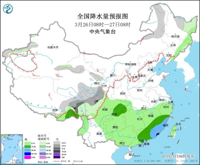 圖3 全國降水量預報圖(3月25日08時-26日08時)