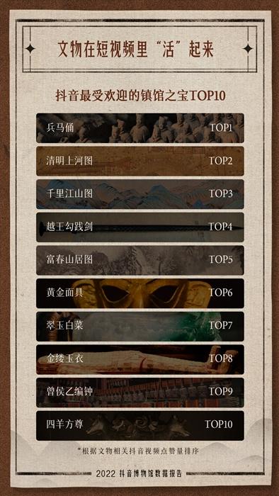 通過(guò)抖音平臺(tái)的短視頻,觀眾可直接觀賞“鎮(zhèn)館之寶”級(jí)別的藏品,與歷史和傳統(tǒng)對(duì)話。報(bào)告顯示,兵馬俑、《清明上河圖》、《千里江山圖》等入選抖音最受歡迎十大鎮(zhèn)館之寶。真珠舍利寶幢、蓮鶴方壺、象首耳獸面紋銅罍等入選抖音關(guān)注度提升最快的文物前十名。