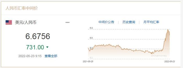 中新財(cái)經(jīng)5月23日電(記者 李金磊) 中國人民銀行授權(quán)中國外匯交易中心公布,2022年5月23日銀行間外匯市場(chǎng)人民幣匯率中間價(jià)為:1美元對(duì)人民幣6.6756元。這較上一交易日大幅調(diào)升731個(gè)基點(diǎn)。此外,在岸人民幣、離岸人民幣對(duì)美元匯率也已升回6.6元時(shí)代。(完)