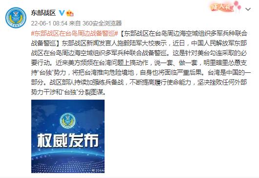 中新網(wǎng)6月1日電 據(jù)中國人民解放軍東部戰(zhàn)區(qū)官方微博1日消息,東部戰(zhàn)區(qū)新聞發(fā)言人施毅陸軍大校表示,近日,中國人民解放軍東部戰(zhàn)區(qū)在臺島周邊??沼蚪M織多軍兵種聯(lián)合戰(zhàn)備警巡。這是針對美臺勾連采取的必要行動。近來美方頻頻在臺灣問題上搞動作,說一套、做一套,明里暗里慫恿支持“臺獨(dú)”勢力,將把臺灣推向危險(xiǎn)境地,自身也將面臨嚴(yán)重后果。臺灣是中國的一部分。戰(zhàn)區(qū)部隊(duì)持續(xù)加強(qiáng)練兵備戰(zhàn),不斷提高履行使命能力,堅(jiān)決挫敗任何外部勢力干涉和“臺獨(dú)”分裂圖謀。