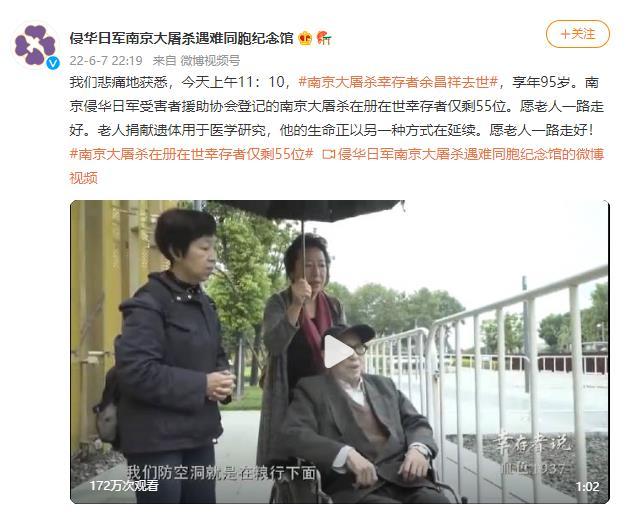 中新網(wǎng)6月8日電 據(jù)侵華日軍南京大屠殺遇難同胞紀(jì)念館官方微博消息,6月7日上午11時(shí)10分,南京大屠殺幸存者余昌祥去世,享年95歲。南京侵華日軍受害者援助協(xié)會(huì)登記的南京大屠殺在冊(cè)在世幸存者僅剩55位。