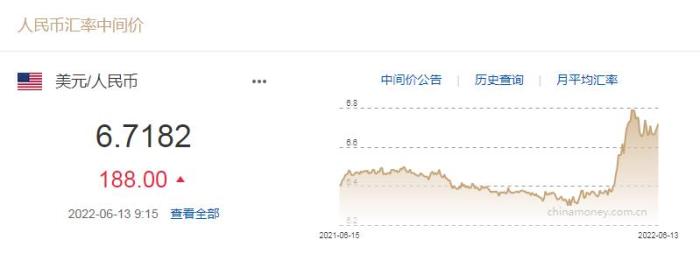 人民幣對美元中間價下調188個基點 1美元對人民幣6.7182元