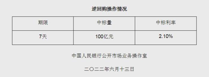 央行6月13日開展100億元逆回購(gòu)操作 中標(biāo)利率2.10%
