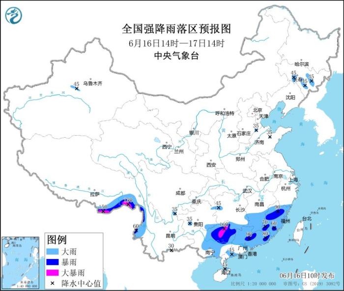 中新網(wǎng)6月16日電 據(jù)中央氣象臺網(wǎng)站消息,中央氣象臺6月16日10時繼續(xù)發(fā)布暴雨藍色預警:預計,6月16日14時至17日14時,福建、江西南部、湖南南部、廣東大部、廣西中東部以及云南西北部、西藏東南部等地的部分地區(qū)有大到暴雨,局地大暴雨(100~160毫米)。上述部分地區(qū)伴有短時強降水(最大小時降雨量20~50毫米,局地可超過60毫米),局地有雷暴大風等強對流天氣。