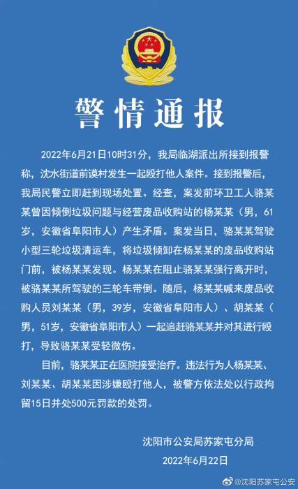 沈陽警方通報(bào)“多人毆打環(huán)衛(wèi)工”:三名打人者被行拘