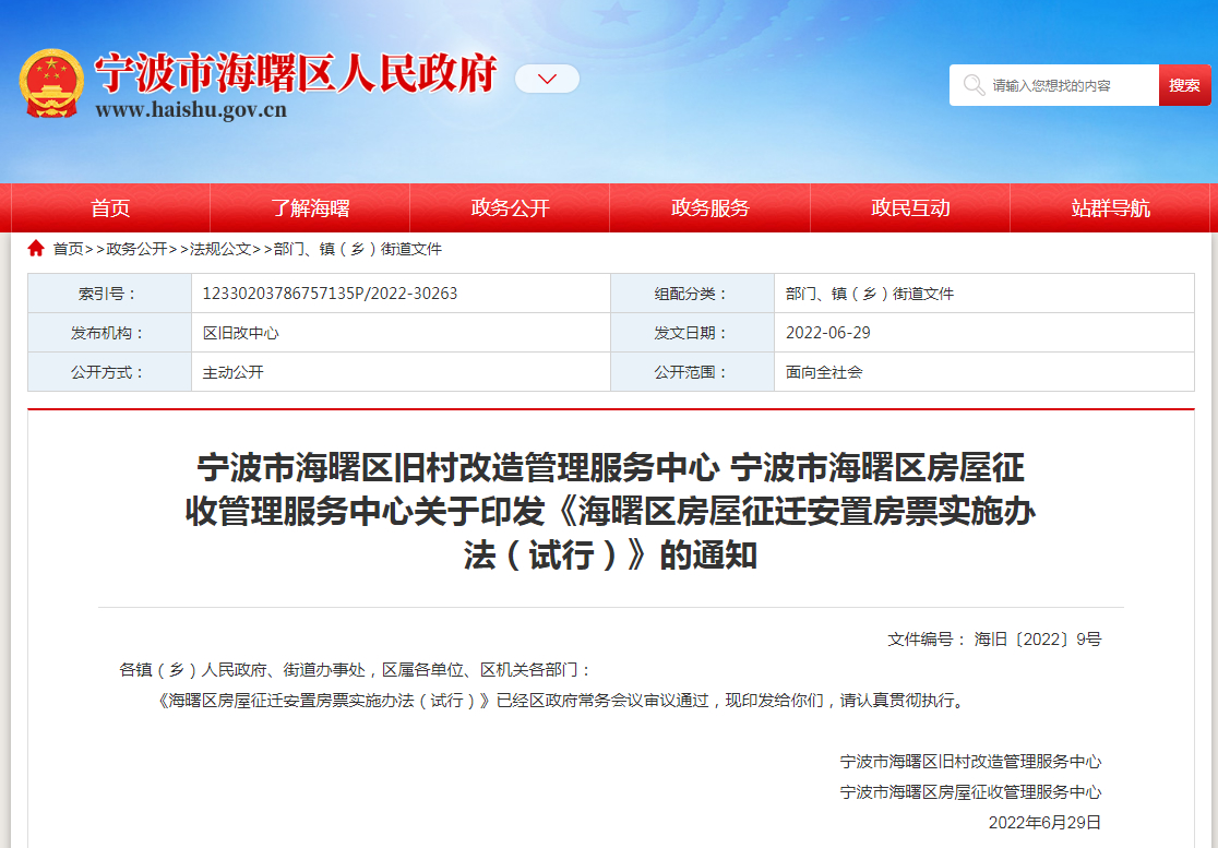 中新網(wǎng)7月5日電 據(jù)寧波市海曙區(qū)政府官網(wǎng),寧波市海曙區(qū)舊村改造管理服務中心、寧波市海曙區(qū)房屋征收管理服務中心近日印發(fā)《海曙區(qū)房屋征遷安置房票實施辦法(試行)》(下稱《實施辦法(試行)》)。