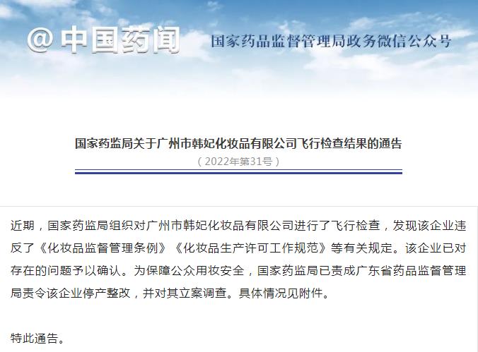 國家藥監(jiān)局:對廣州市韓妃化妝品有限公司立案調查