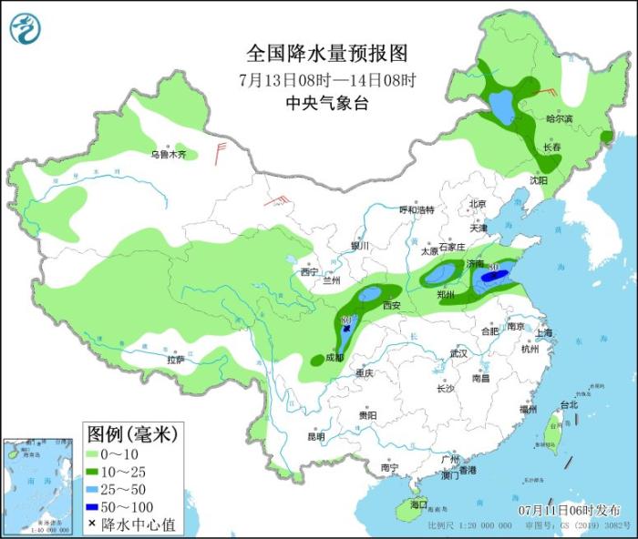 7月13日08時至14日08時,甘肅東南部、陜西關中地區(qū)、內蒙古東北部、吉林西部、遼寧北部、山西南部、河北南部、河南北部和東部、山東中南部、蘇皖北部及四川盆地西北部等地的部分地區(qū)有中到大雨,其中,山東南部、四川盆地西北部等地局部地區(qū)有暴雨(50~80毫米)。黑龍江西南部、新疆東部等地部分地區(qū)有4~6級風。南海西南部海域將有5~6級、陣風7級的西南風。